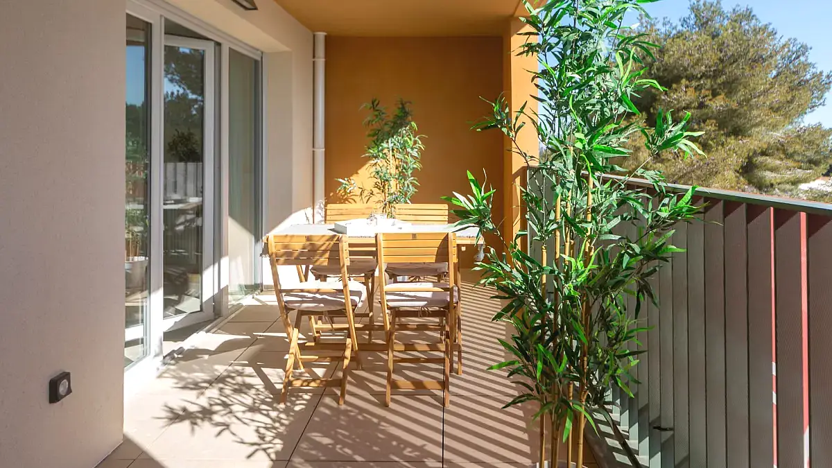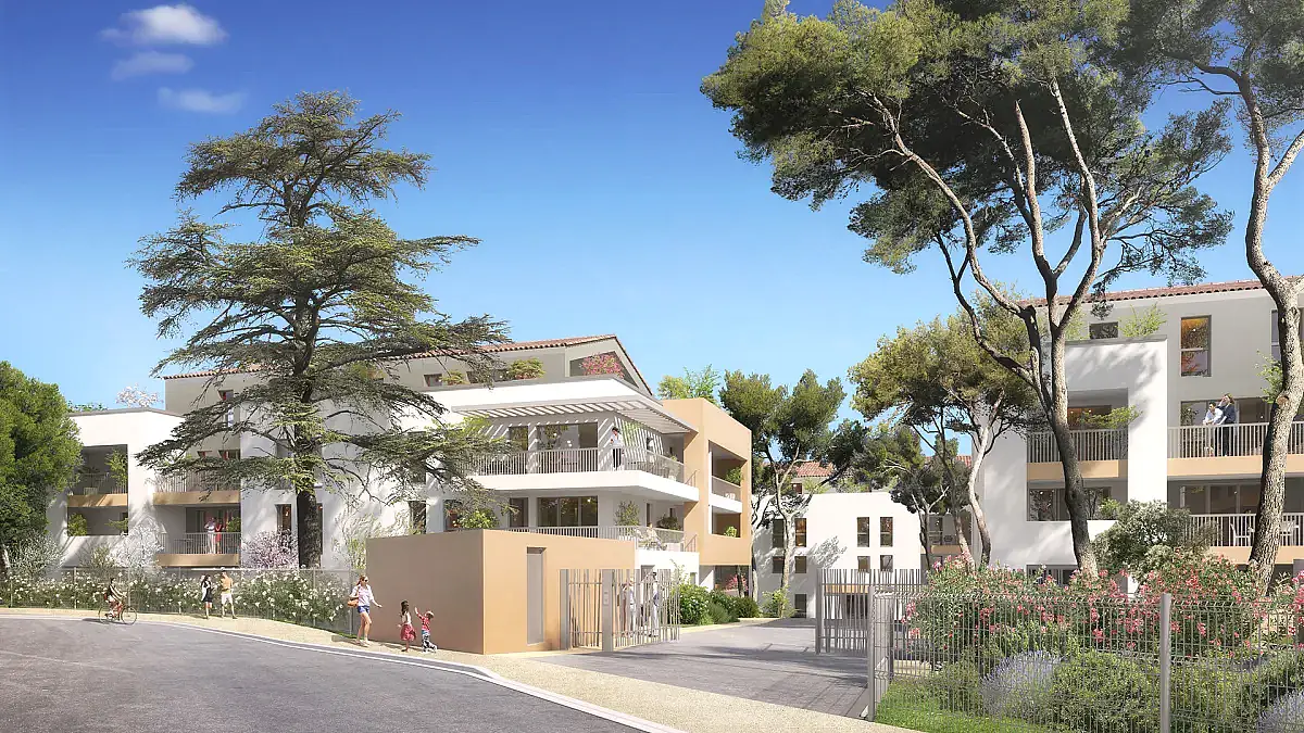 Dès l’entrée, un portail élégant ouvre sur un écrin de nature où oliviers, pins d’Alep, cyprès et chênes enveloppent les bâtiments d’une atmosphère provençale apaisante. Les façades, habillées de teintes naturelles, dévoilent une architecture sobre et raffinée, répartie sur deux étages et de vastes attiques dominant un jardin paysager. Des carrés potagers et un boulodrome complètent ce cadre convivial pensé pour le bien‑être des résidents.